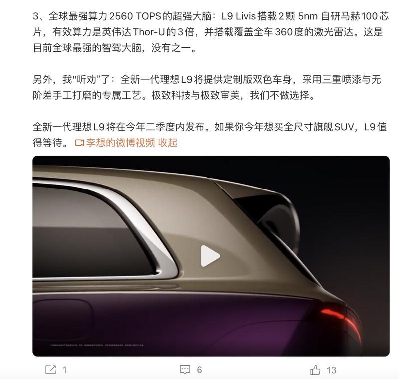 侧面来看,新车拥有流畅犀利的腰线寸轮圈,并配备了侧向固态激光雷达。值得一提的是,全新理想L9搭载2颗5nm自研马赫100芯片,有效算力是英伟达Thor-U的3倍,并搭载覆盖全车360度的激光雷达。